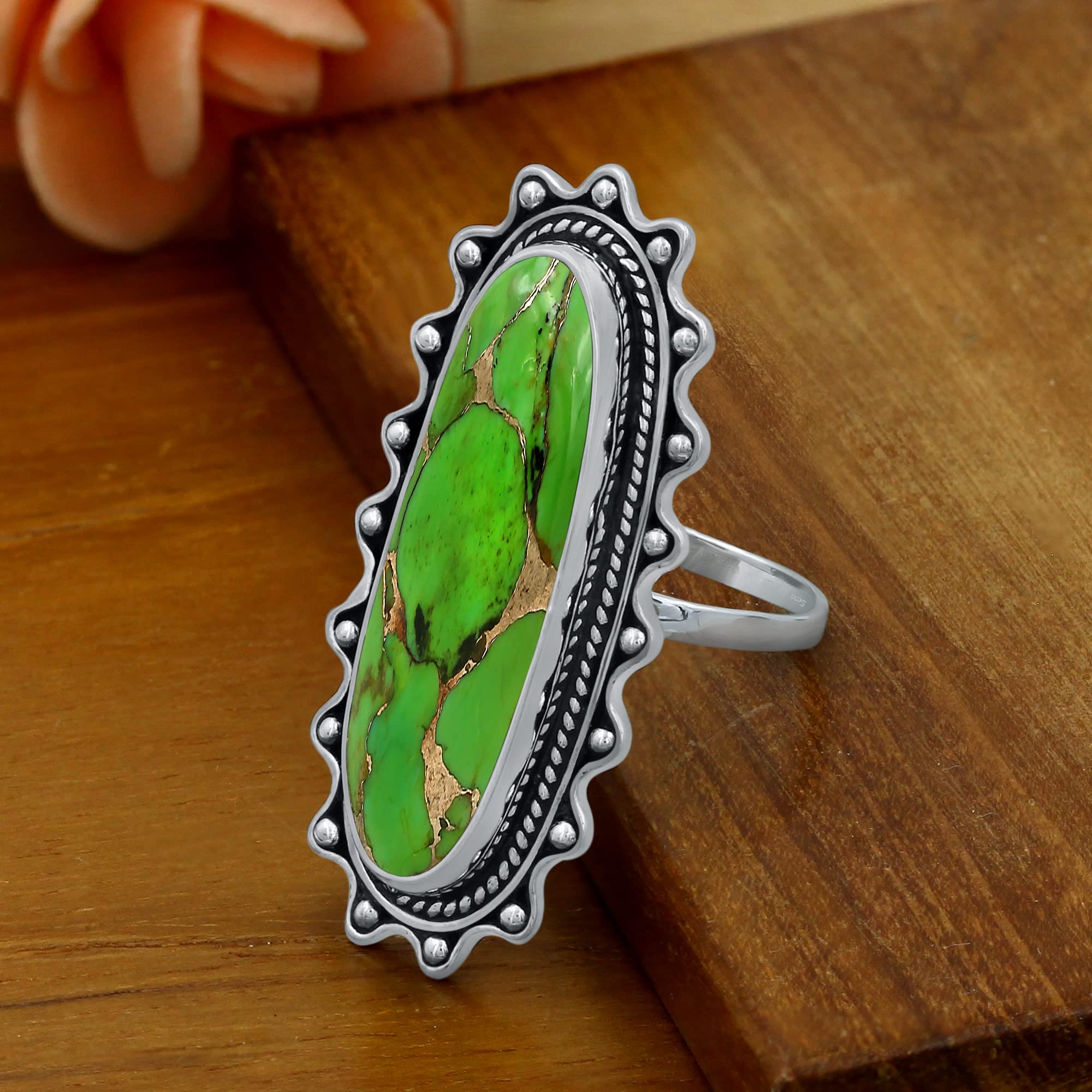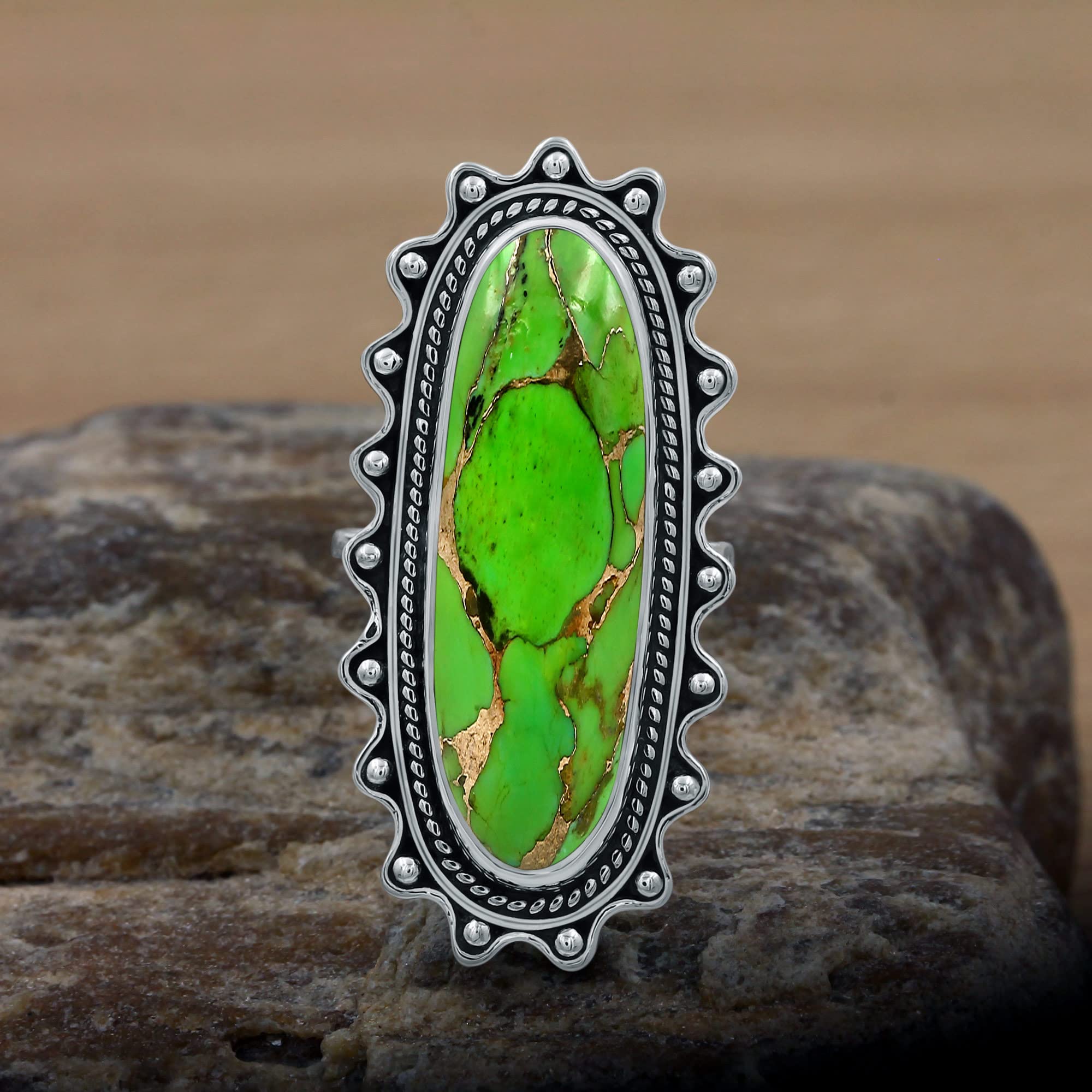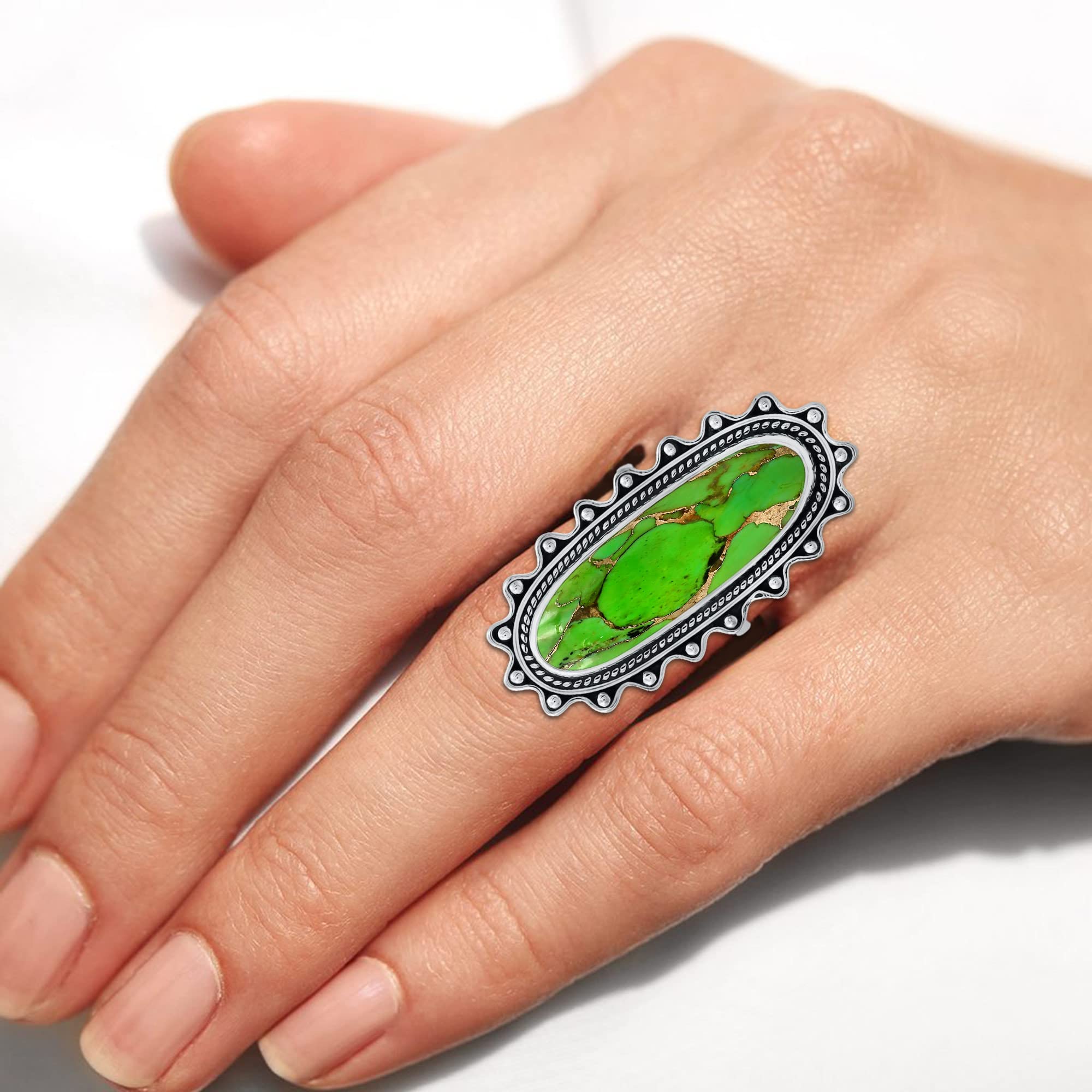 • Featured/Specifications Dimensions of Ring: Approx 38mm X 16mm | Metal: Solid 925 Sterling Silver (925/1000) | Finish: High Polish | Stone: Natural Green Copper Turquoise, | Stone Size: 10X30mm Oval