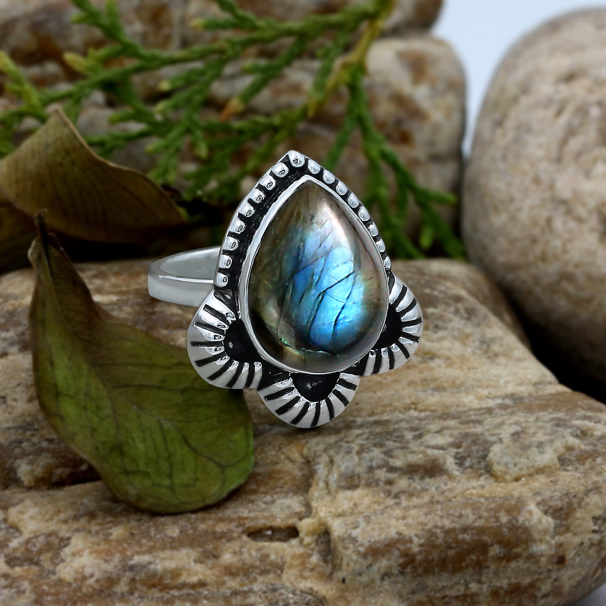 • Featured/Specifications Dimensions of Ring: Approx 23mm X 19mm | Metal: Solid 925 Sterling Silver (925/1000) | Finish: High Polish | Stone: Natural Labradorite, | Stone Size: 12x16mm Pear