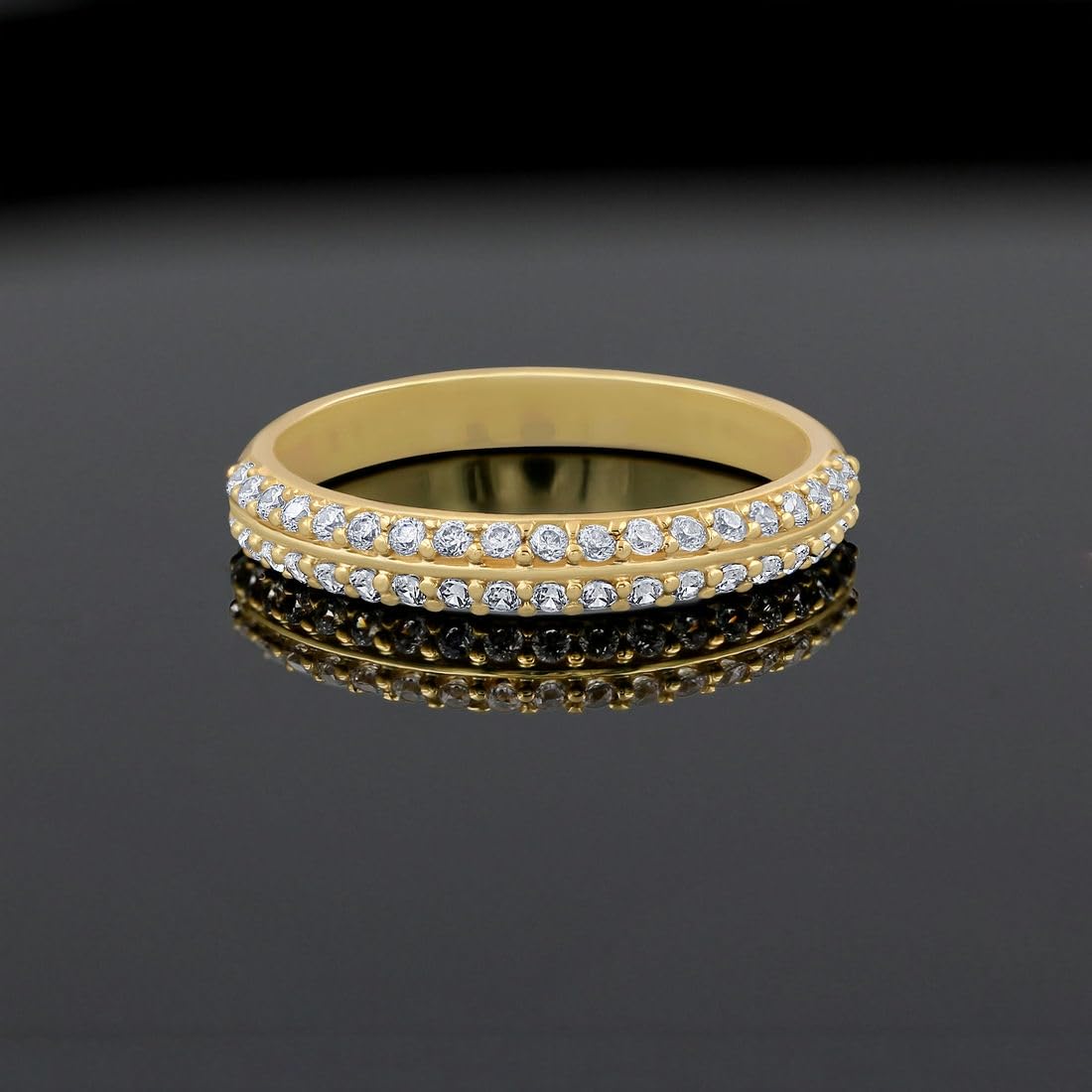 • Specification - 3.00Mm Wide Band Classic Double Row Half Eternity Stackable Band, Paved With Simulated Diamond Stones. It Is The Perfect Complement To Many Engagement Ring Styles And Looks Lovely When Stacked. This Stunningwwedding Ring Is Crafted In Yellow Gold Plated Brass, With Anti-Tarnish Coating, Never Loses Its Luster Making It The Perfect Choice For Women Who Love A Little Bit Of Bling.
