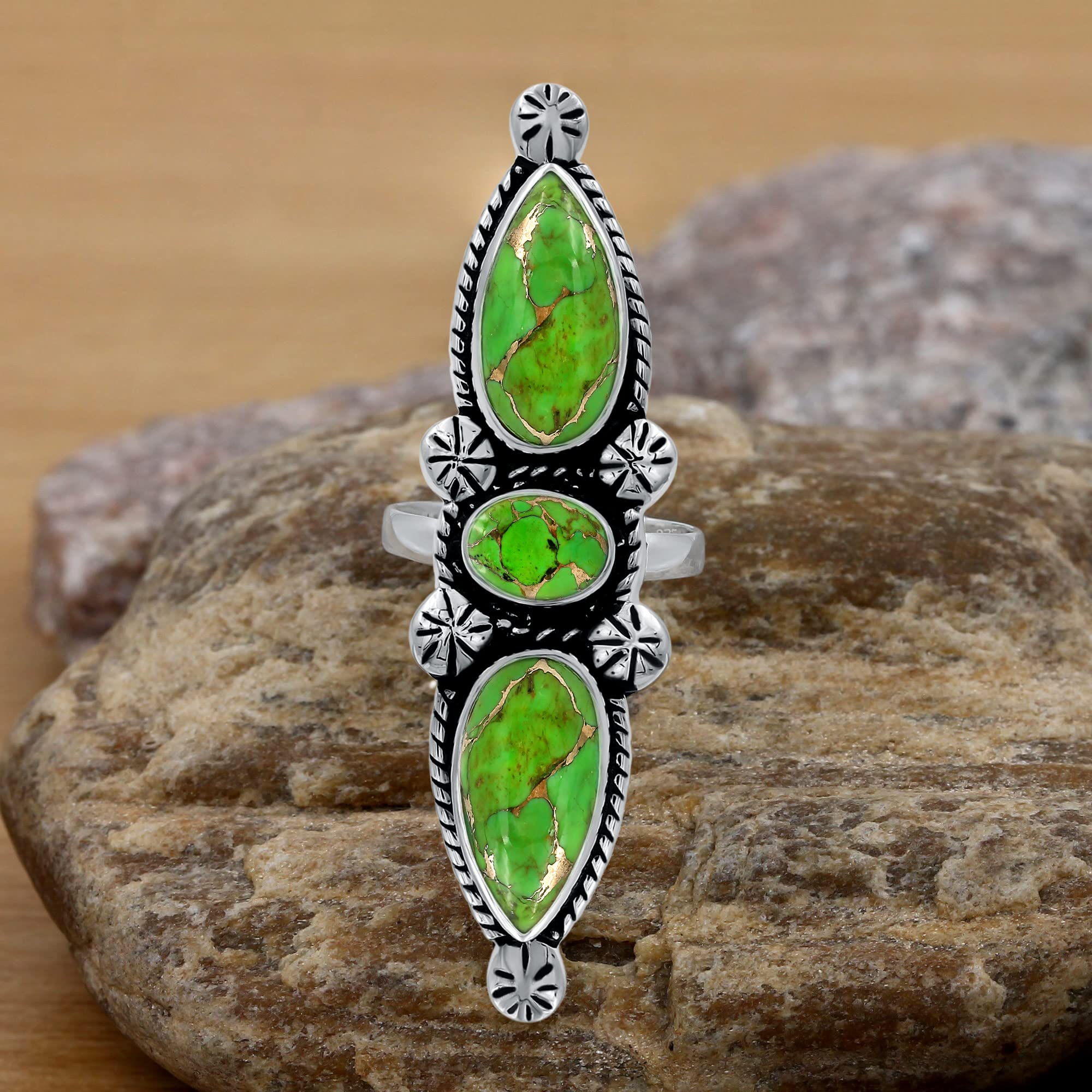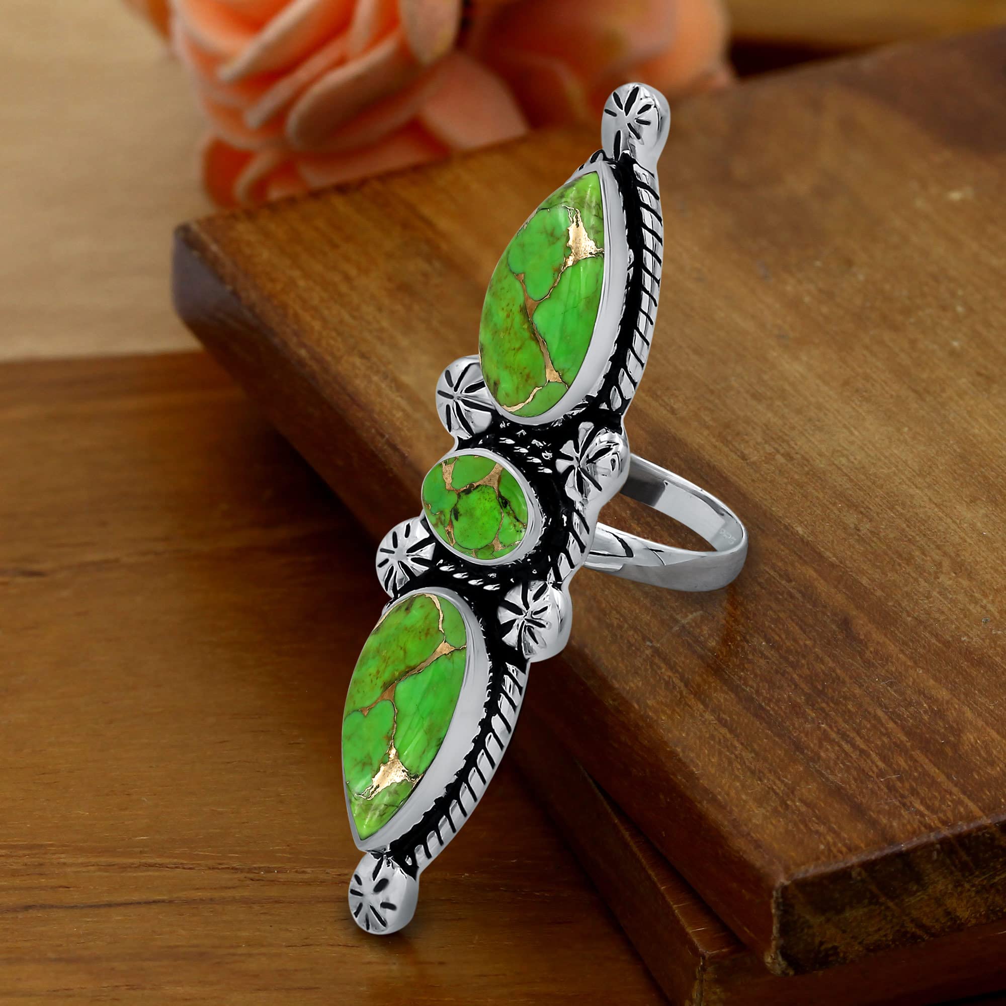 • Featured/Specifications Dimensions of Ring: Approx 53mm X 20mm | Metal: Solid 925 Sterling Silver (925/1000) | Finish: High Polish | Stone: Natural Green Copper Turquoise, | Stone Size: 8x16mm Pear, 6x8mm Oval
