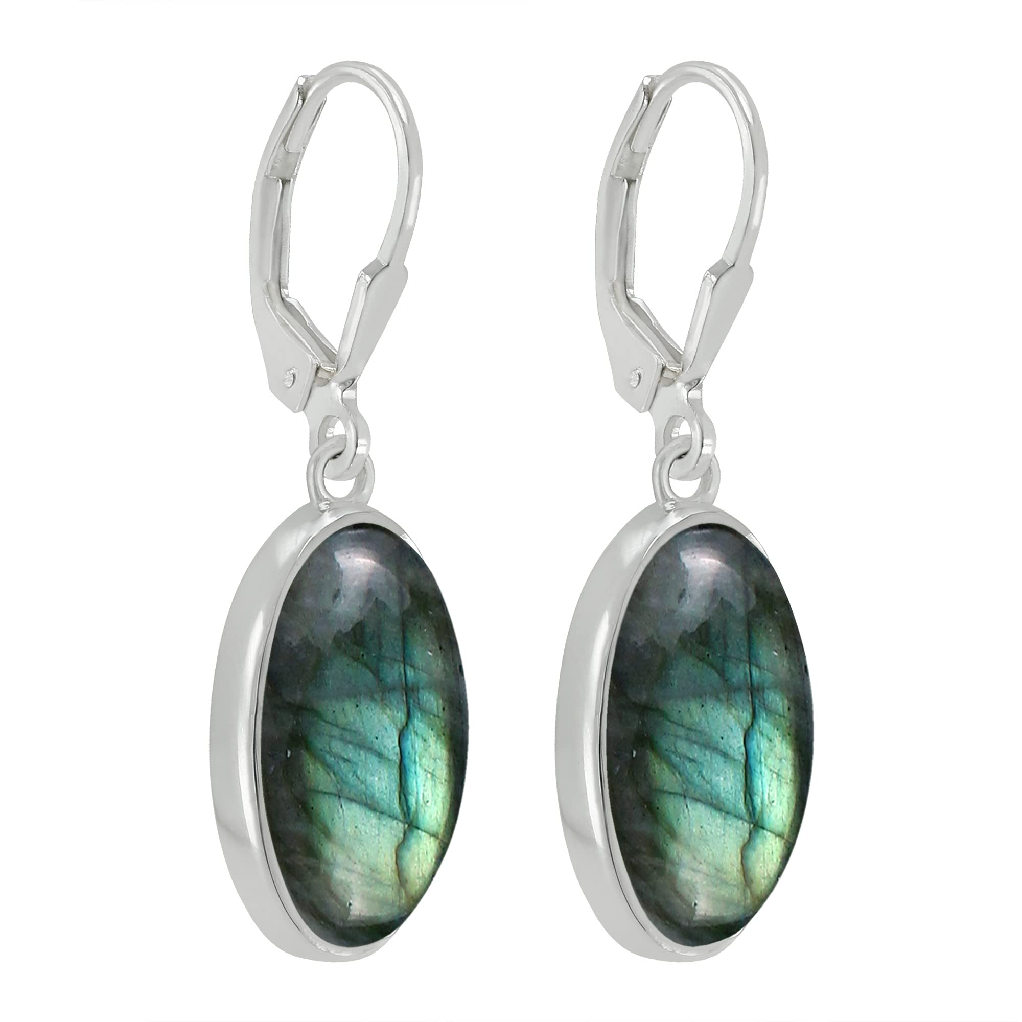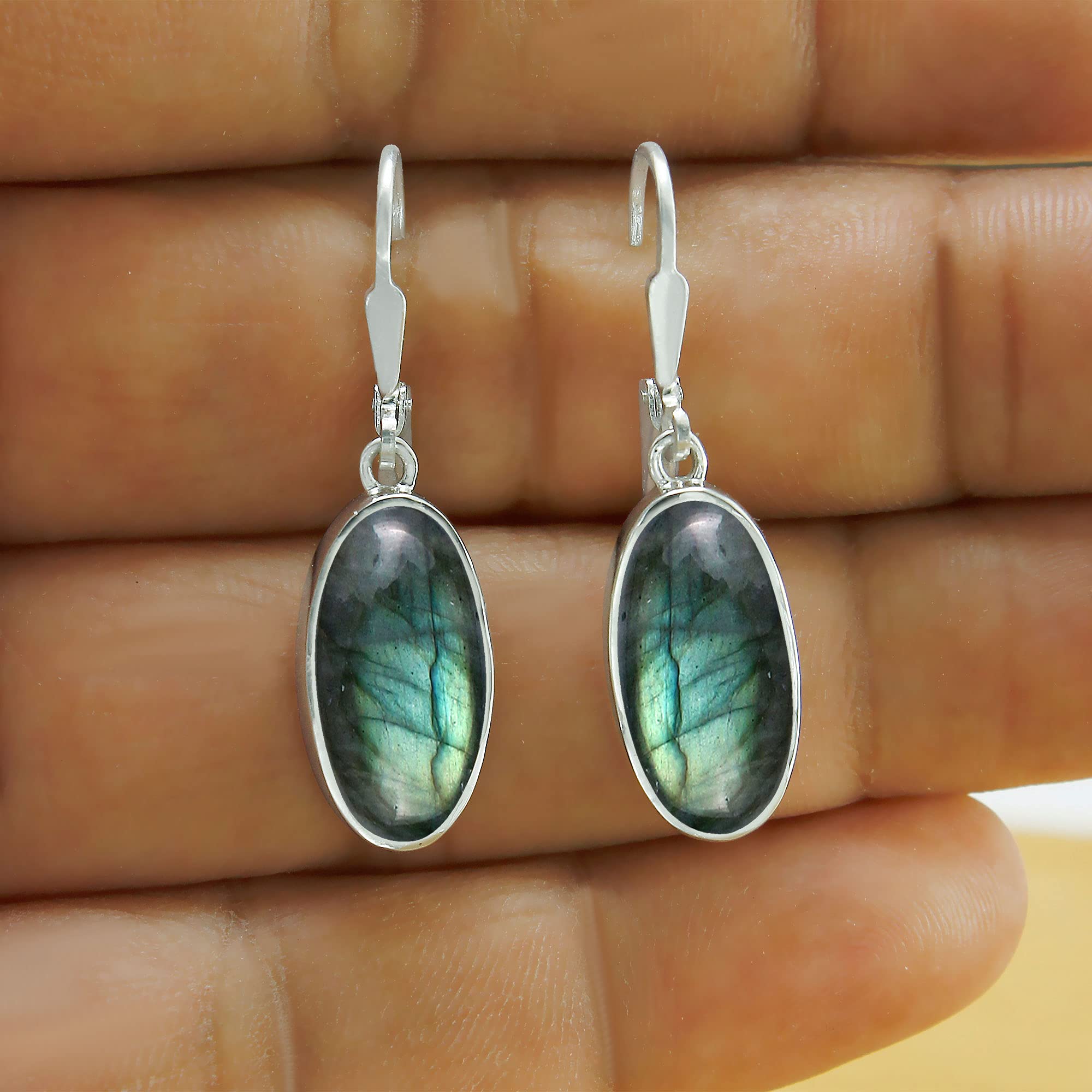 • Featured/Specifications Dimension of Earrings : 33mm X 10mm| Metal: Solid 925 Sterling Silver (925/1000) | Finish: High Polish | Stone: Natural Labradorite, | Stone Size: 8x16mm Oval