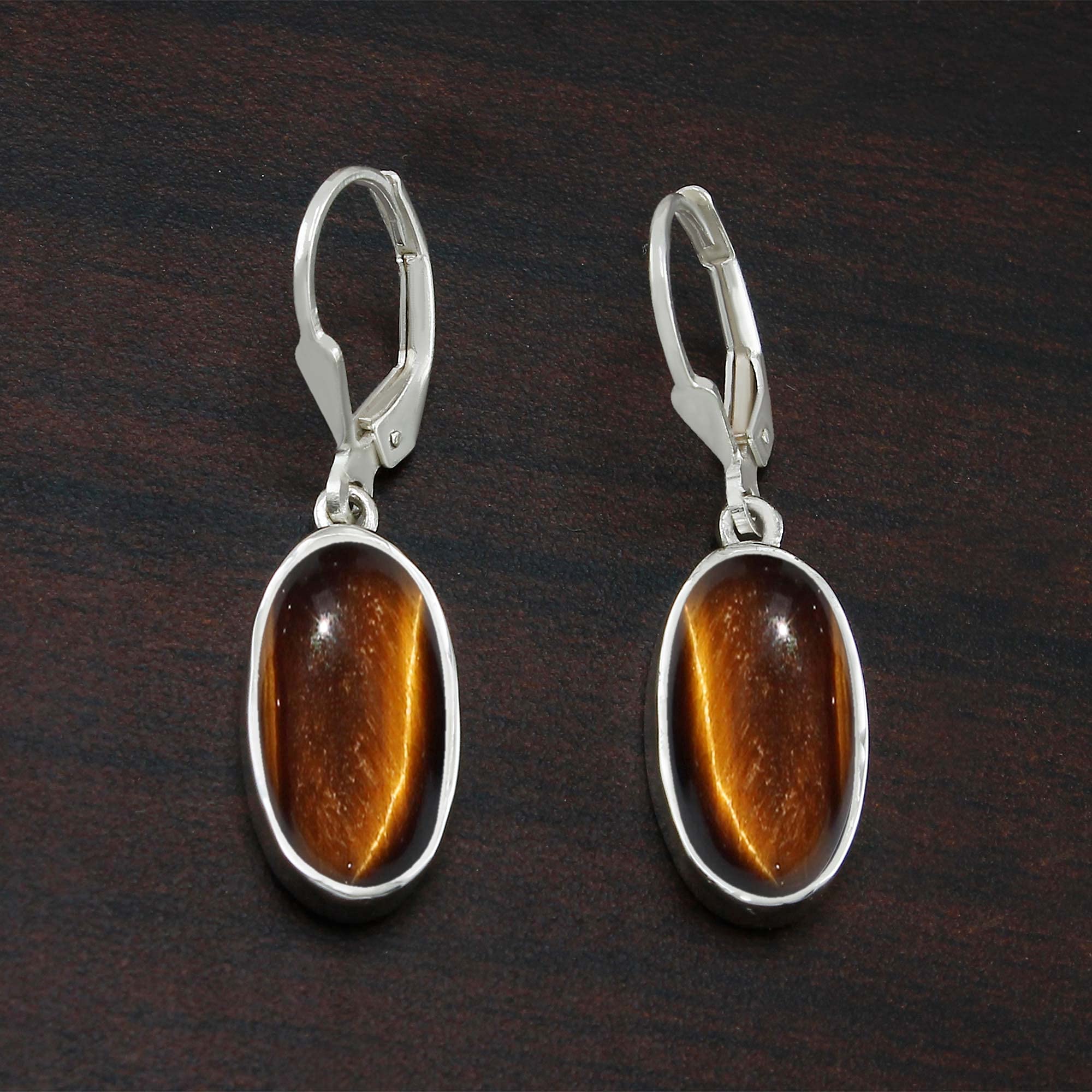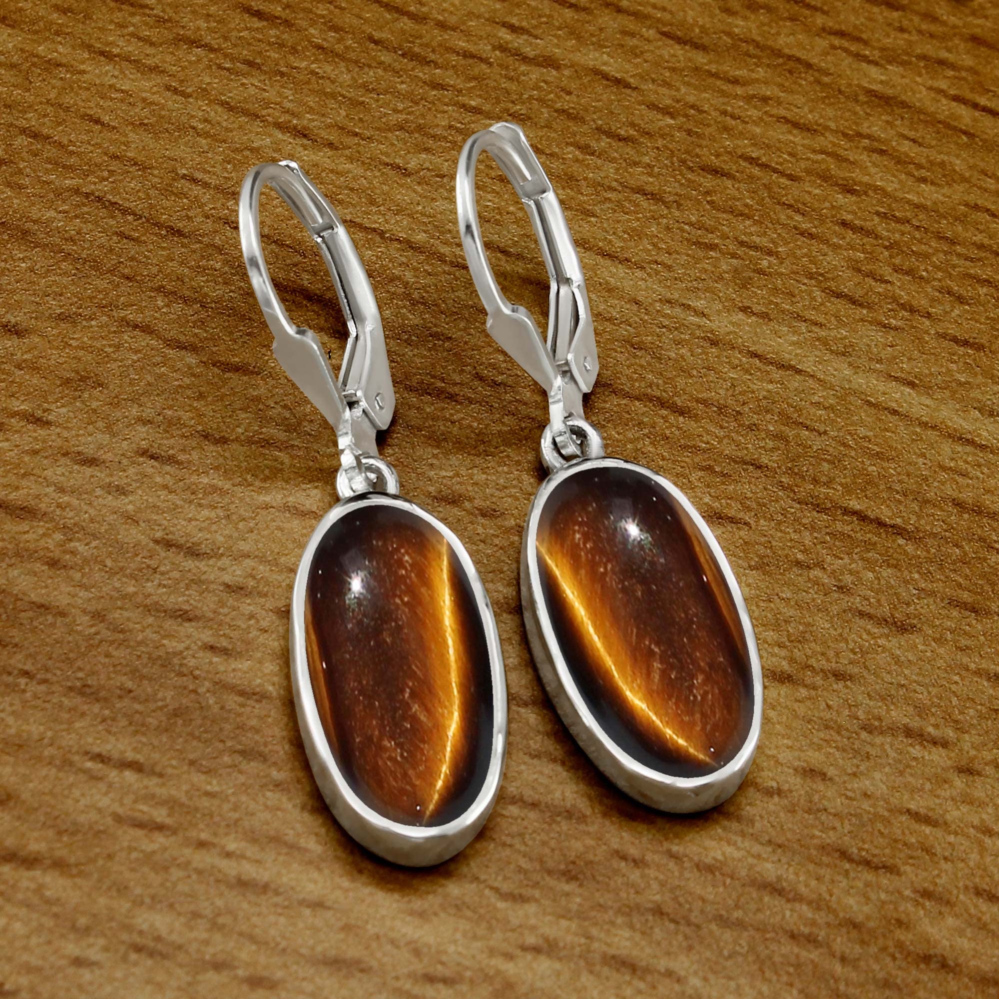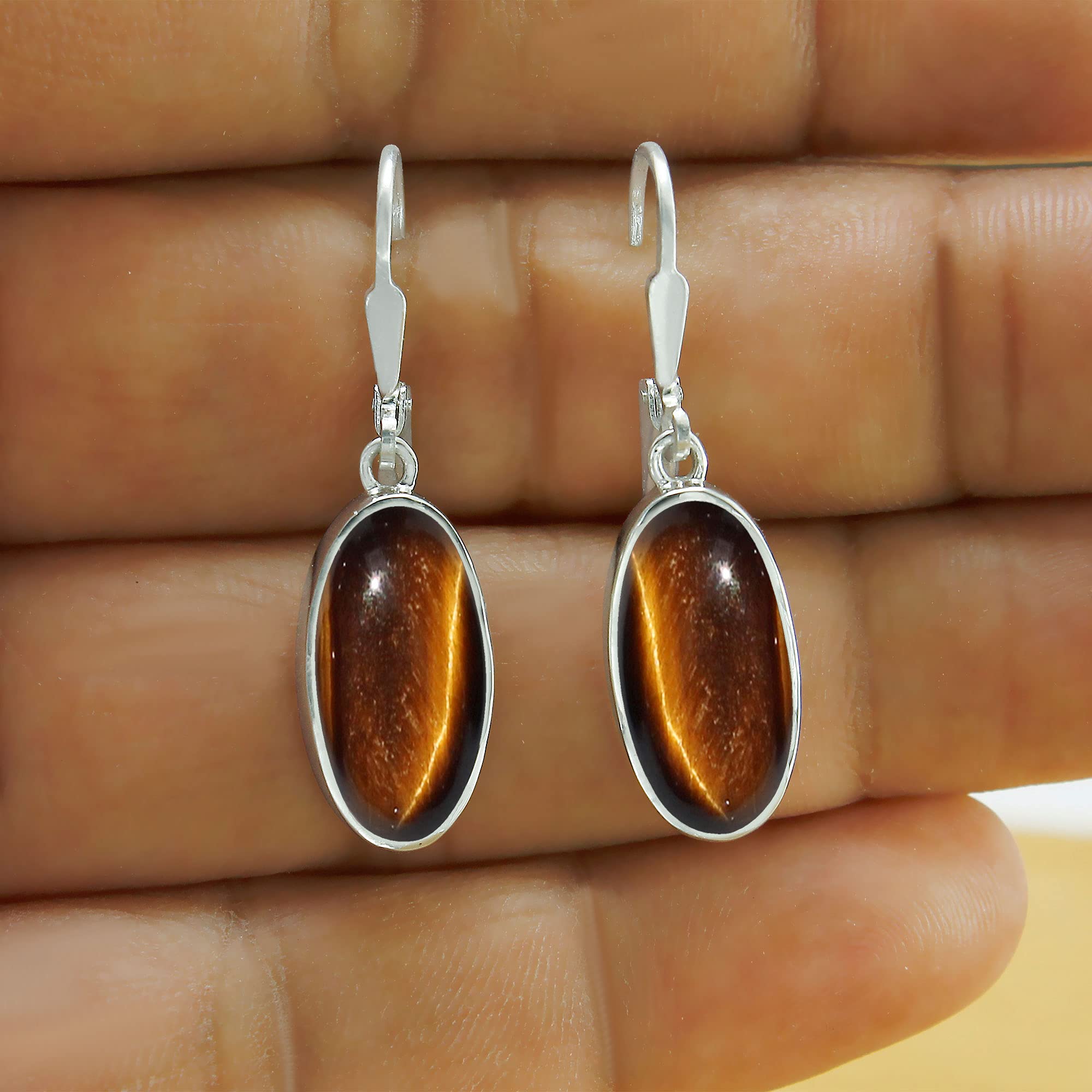 • Featured/Specifications Dimension of Earrings : 33mm X 10mm| Metal: Solid 925 Sterling Silver (925/1000) | Finish: High Polish | Stone: Natural Tiger Eye, | Stone Size: 8x16mm Oval